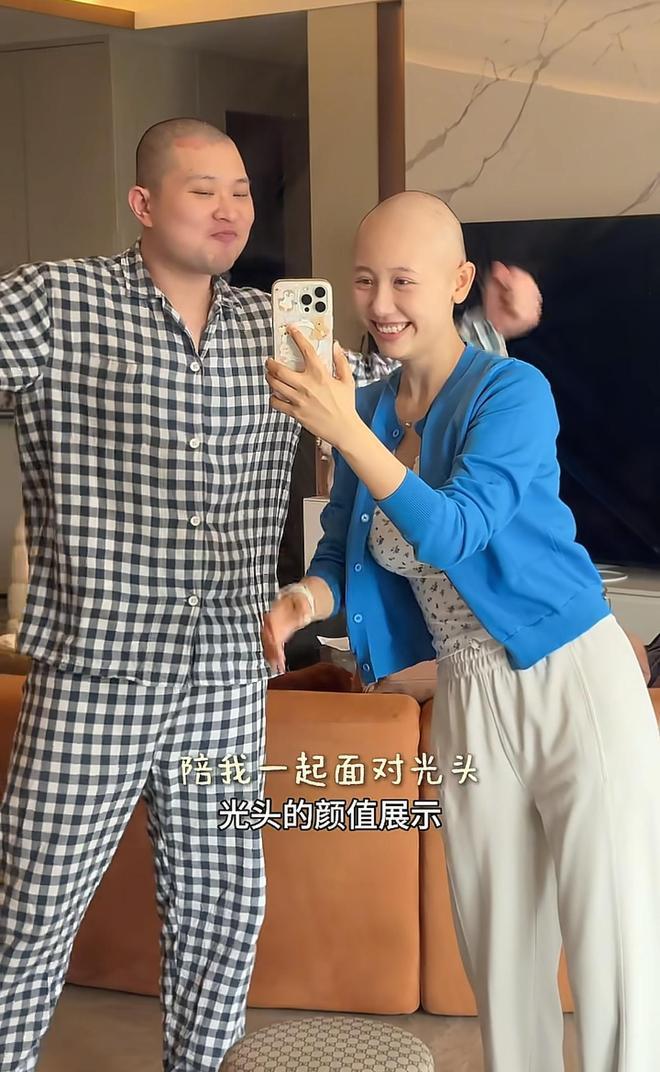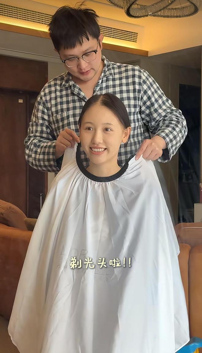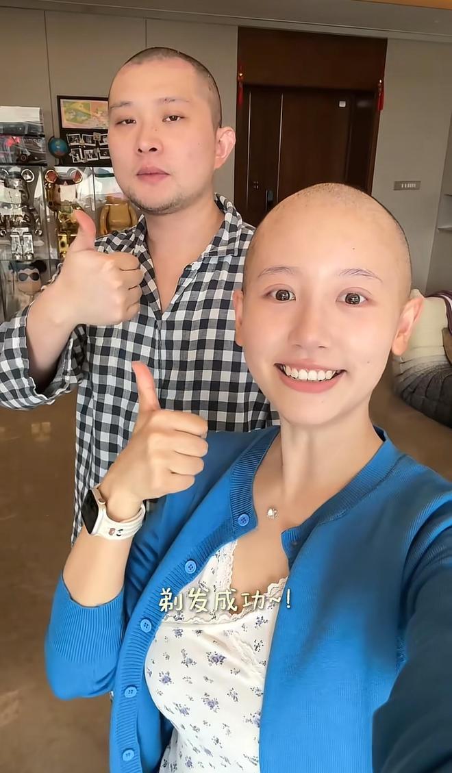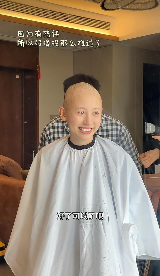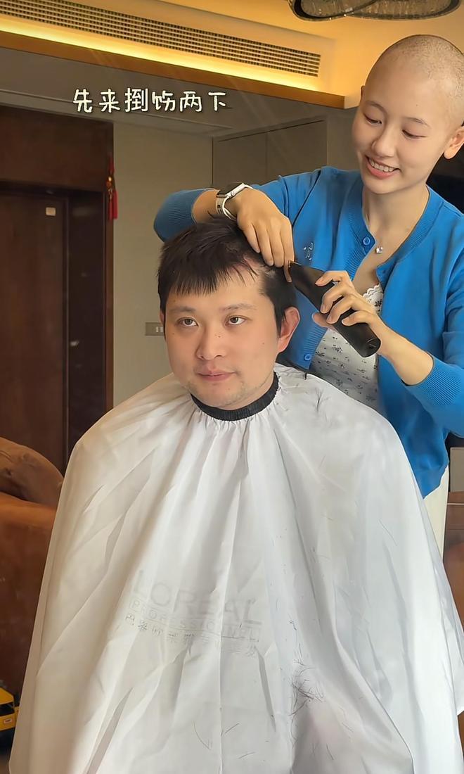 值得一提的是,一栗小莎子的老公不仅逗笑妻子,还陪着妻子一起剃光头。