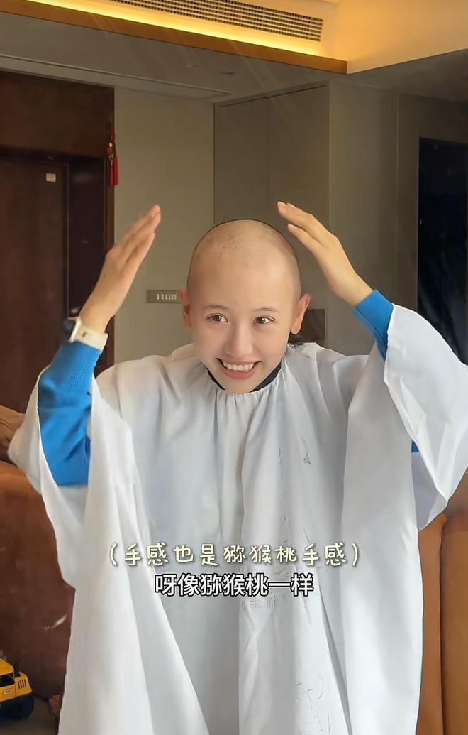 当剃完头发,一栗小莎子说摸着自己的光头像摸猕猴桃一样。