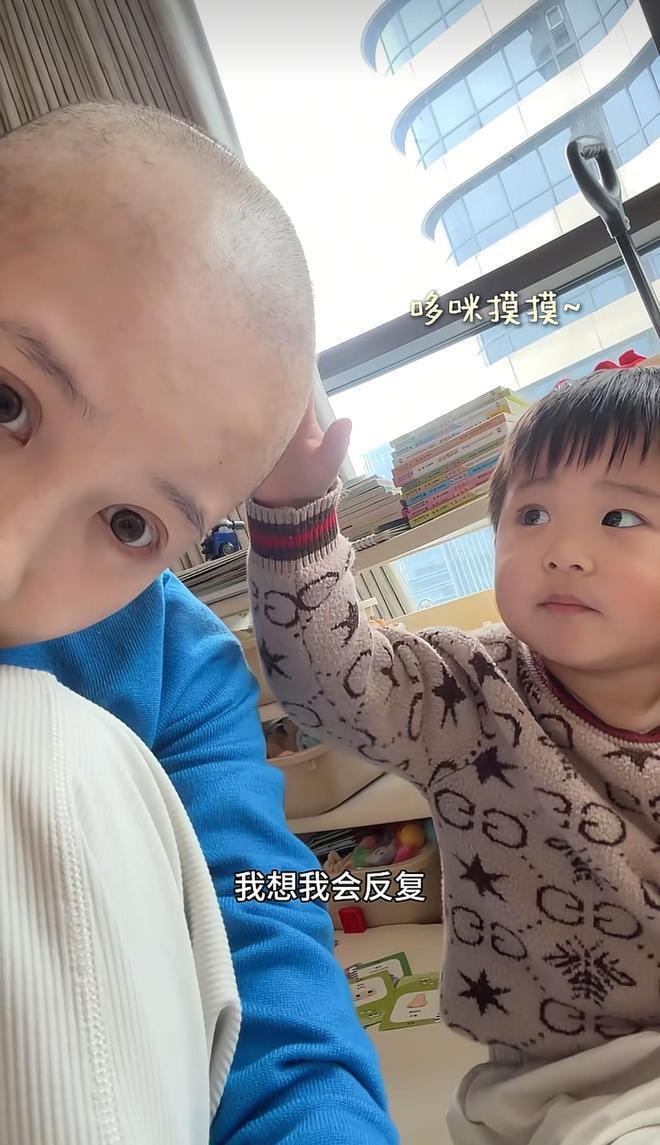 因为大家都知道孩子还小,不知道妈妈剃光头意味着什么,只是好奇。